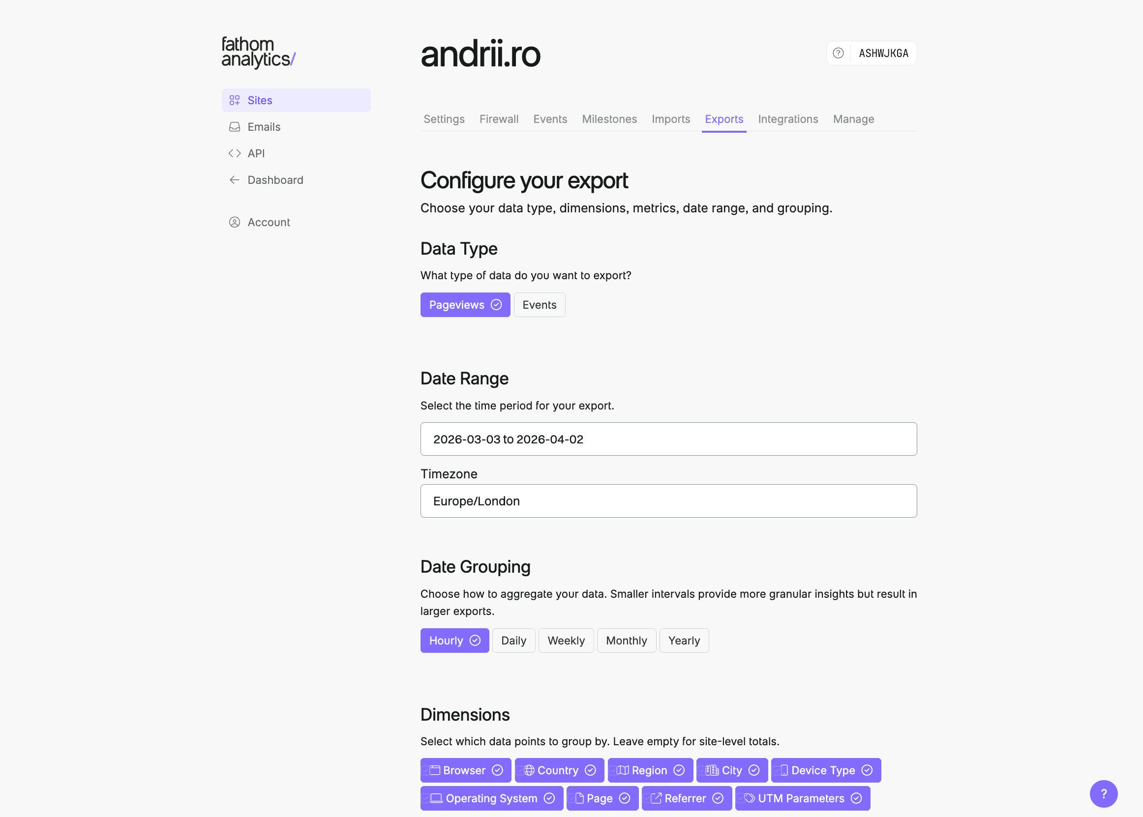 If you have tracked custom events with Fathom, you can also export them (under the Events tab) - for custom events make sure to also select Hourly for Date Grouping, as well as all available Dimensions and Metrics.