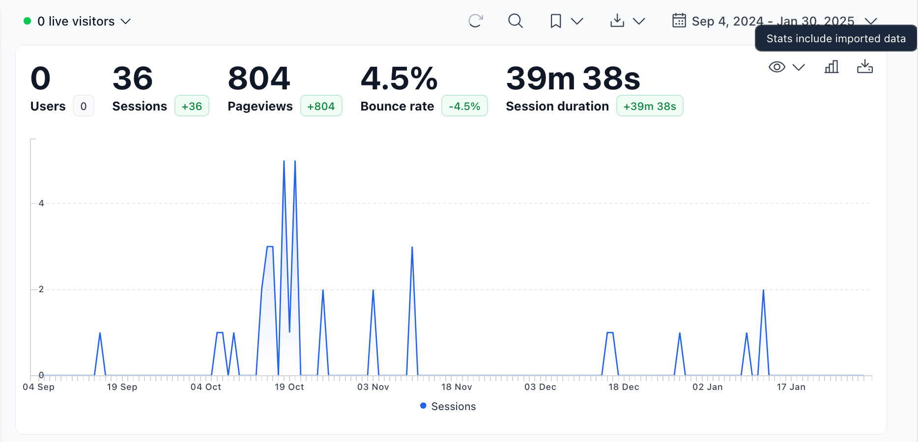 Once an import completes, the data is immediately available in your analytics dashboard. When you select a date range that includes imported data, a small "Imported" badge appears near the period selector to let you know.