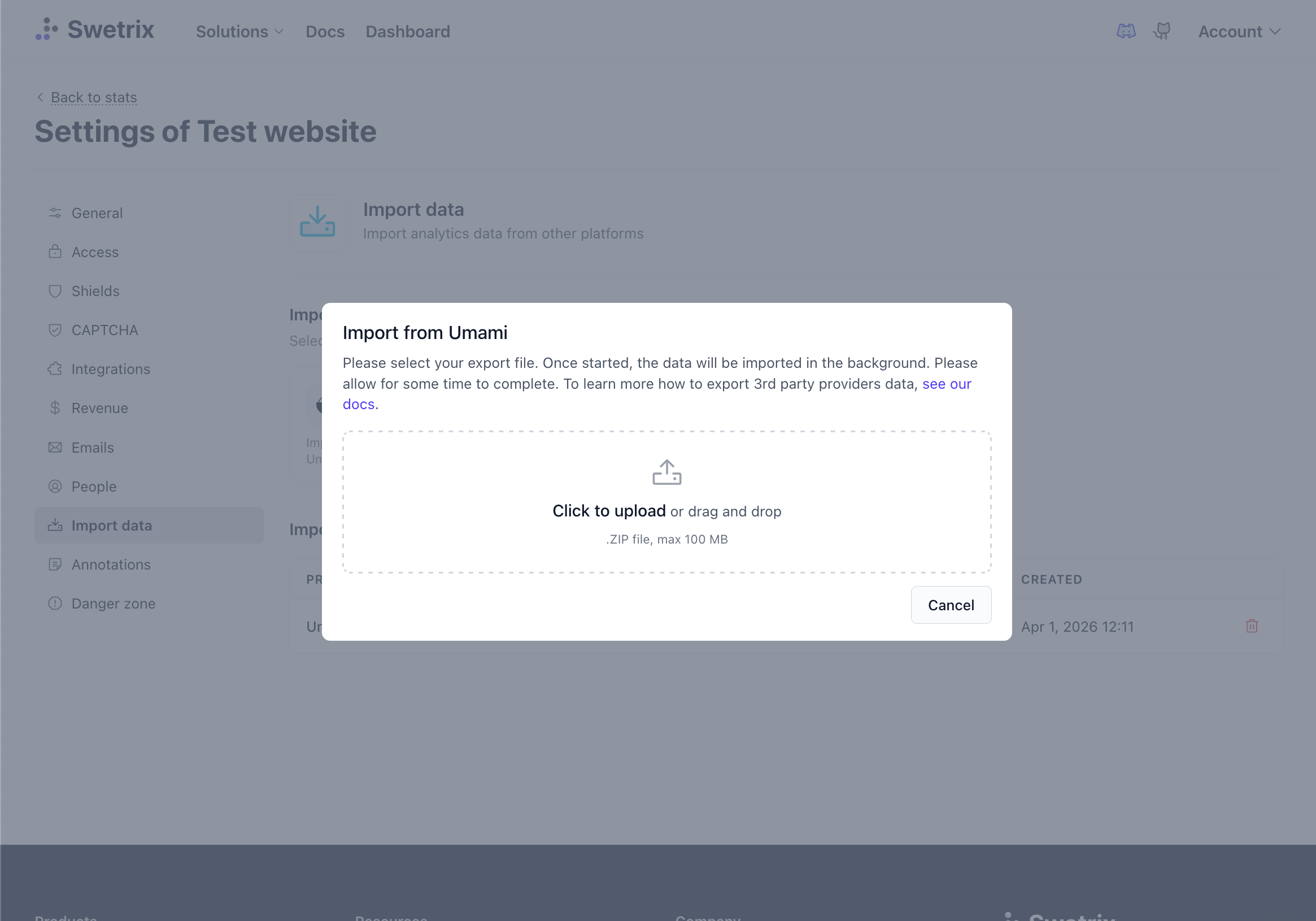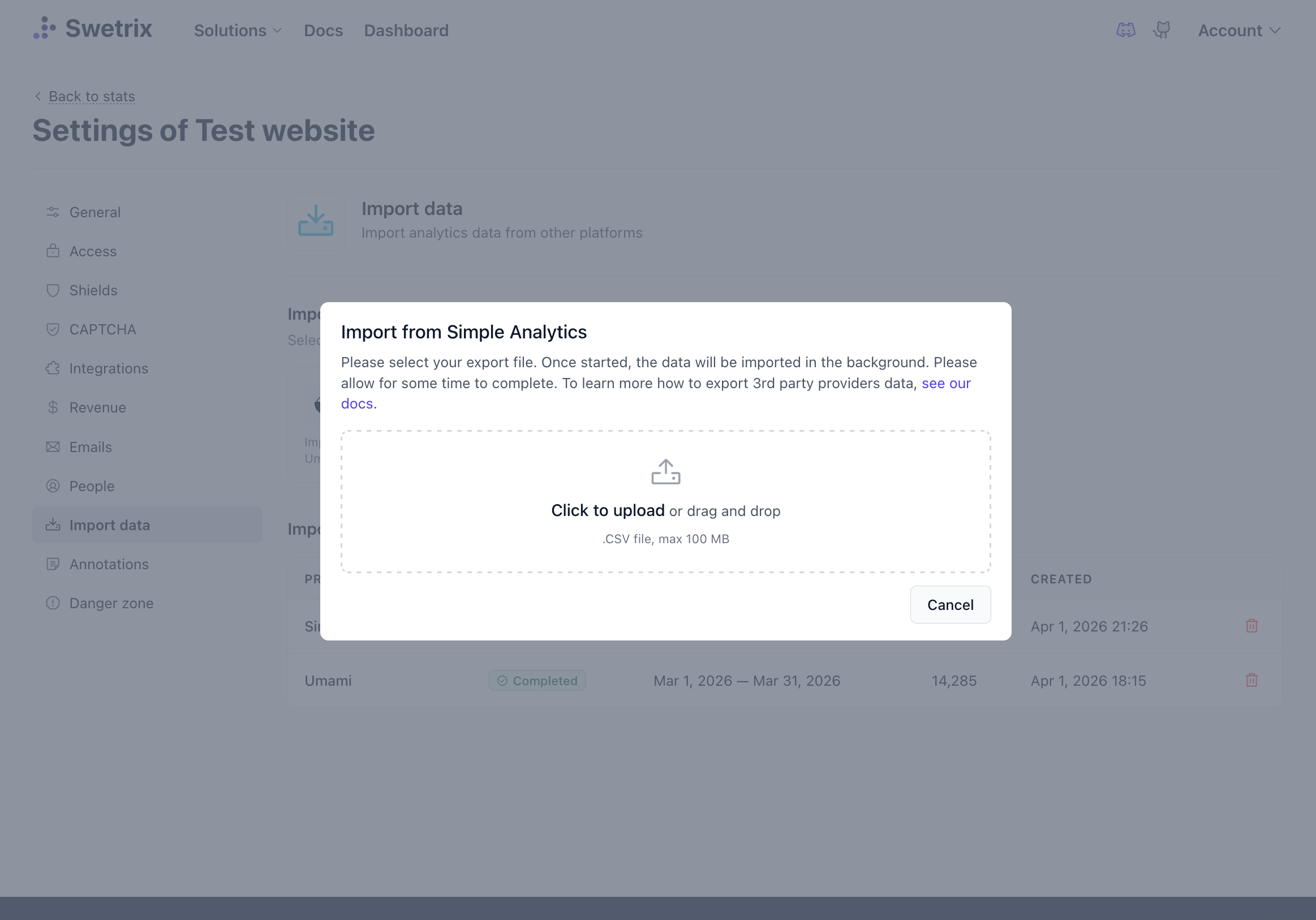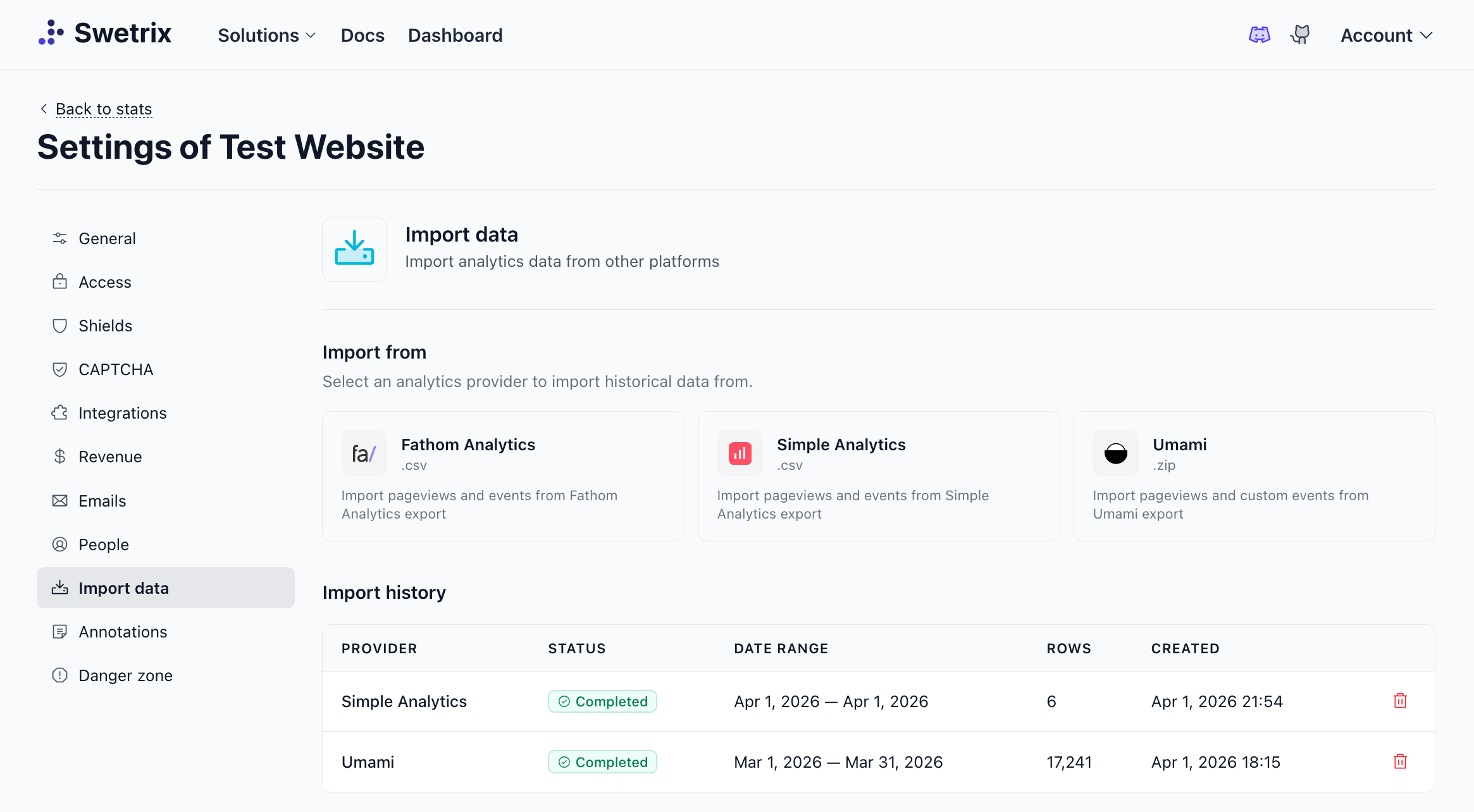 Swetrix allows you to import historical analytics data from other platforms so you can switch without losing your history. Imported data appears alongside your live-tracked data in dashboards, charts, and reports. It's tagged internally so it can be identified and, if needed, removed later without affecting your live-tracked data.